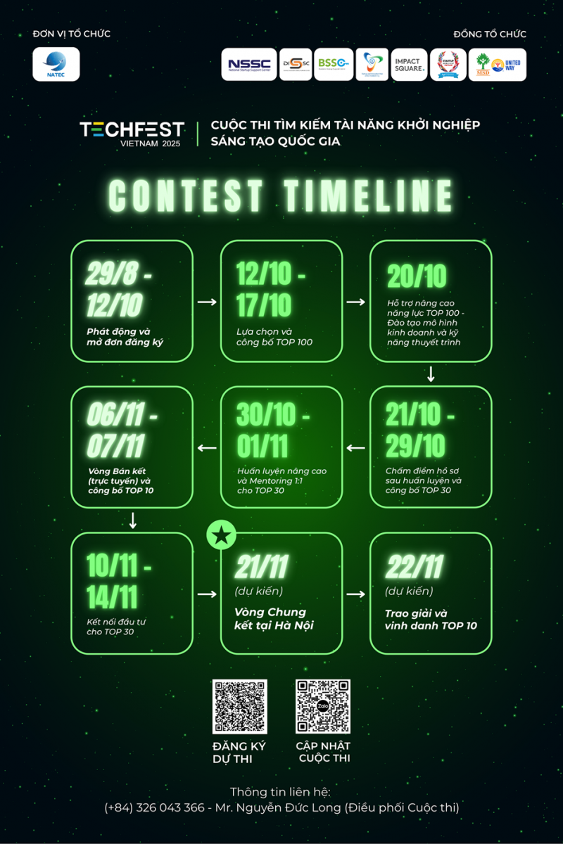 🔹Ngày 22/11 (dự kiến): Trao giải và vinh danh TOP 10 – Những gương mặt xuất sắc nhất Cuộc thi TECHFEST Việt Nam 2025 chính thức được gọi tên và nhận được những giải thưởng vô cùng giá trị!