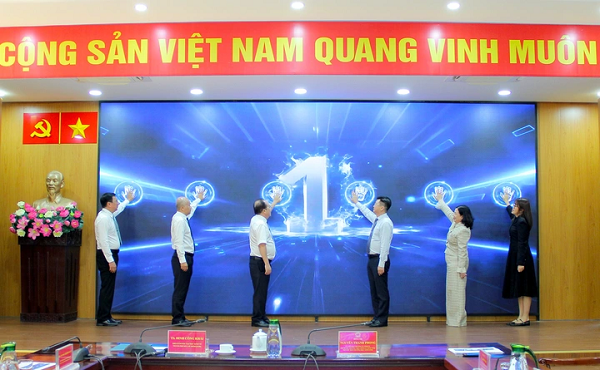Các đại biểu thực hiện nghi thức ra mắt Nền tảng trực tuyến hỗ trợ ươm tạo khởi nghiệp sáng tạo tỉnh An Giang (khoinghiep.angiang.gov.vn).