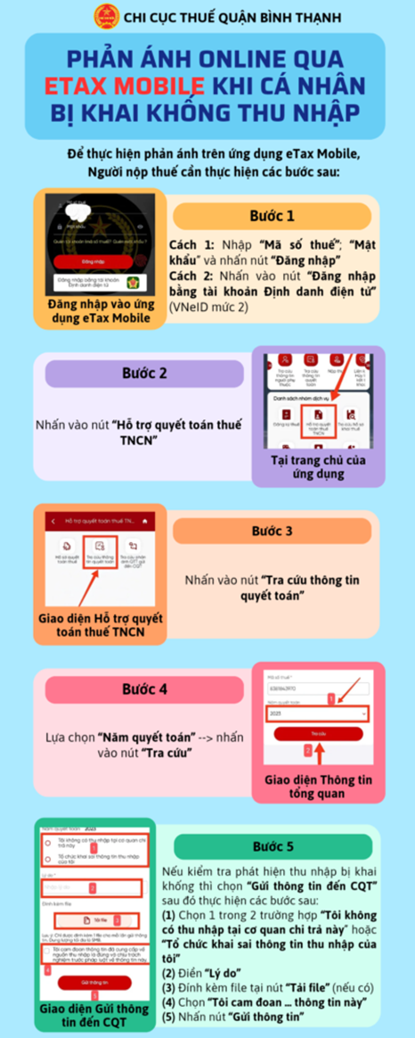 Cục Thuế cho biết, hiện trên ứng dụng eTax Mobile, người nộp thuế có thể phản ánh trực tiếp với cơ quan thuế để làm rõ tình trạng khai khống thu nhập.