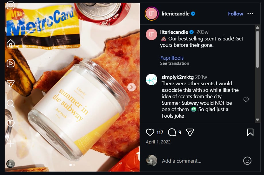 Đôi khi, chìa khóa để một bài đăng lan truyền mạnh mẽ là quảng bá một sản phẩm lẽ ra không nên tồn tại. Bài đăng ngày Cá tháng Tư này từ Literie Candle, một công ty có trụ sở tại New York, giới thiệu một loại nến "mới" có tên "Mùa hè trên tàu điện ngầm". Vì New York nóng và ẩm vào mùa hè, và tàu điện ngầm thường đông đúc và ngột ngạt, nên đây là một mùi hương vô lý để bất cứ ai muốn mua - nhưng đó chính là trò đùa .