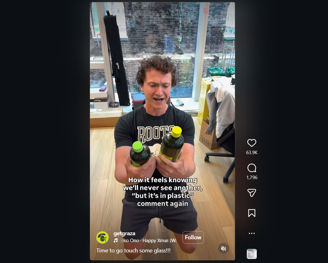 Mặc dù việc video lan truyền nhanh chóng có thể là một cách hữu hiệu để thu hút người theo dõi mới cho thương hiệu của bạn, nó cũng có thể tương tác và thu hút khán giả hiện có. Đoạn video ngắn trên Instagram của nhà sản xuất dầu ô liu Graza là một ví dụ điển hình. Trong đó, thương hiệu này thông báo rằng sản phẩm đặc trưng của họ hiện được đựng trong chai thủy tinh thay vì chai nhựa. Các nhân viên được thể hiện đang ăn mừng bên dưới dòng chú thích: “Cảm giác thật tuyệt khi biết rằng chúng ta sẽ không bao giờ nghe thấy bình luận kiểu ‘nhưng nó đựng trong chai nhựa’ nữa”. Với hơn một triệu lượt xem , đây là một trong những video trên mạng xã hội thành công nhất của Graza từ trước đến nay.