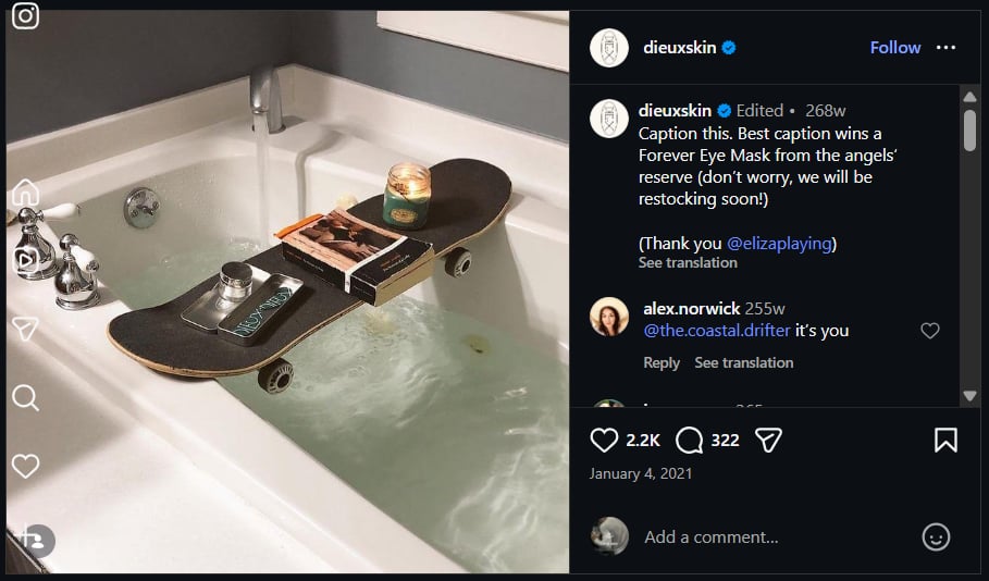 Bức ảnh khá độc đáo, mô tả một chiếc ván trượt được đặt cân bằng trên bồn tắm, bên trên là một cây nến, một cuốn sách và một chiếc mặt nạ ngủ Dieux Forever. Sự khác biệt của nó khiến người dùng dừng lại và muốn đọc chú thích, trong đó nêu rõ người viết chú thích hay nhất sẽ nhận được một chiếc mặt nạ ngủ Forever Eye Mask. Loại bài đăng này khuyến khích sự tương tác từ những người theo dõi hiện tại và tạo động lực cho họ chia sẻ bài đăng với mạng lưới bạn bè của mình.